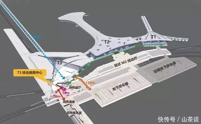 京滨高铁、地铁Z2线、M2线、双湖线共1条高铁3条地铁交汇在T3航站楼前,通过T3综合换乘中心接驳地上地下六个楼层,形成多维立体换乘空间,实现了旅客换乘无缝衔接、流线清晰、距离较优。地铁与T3换乘最近距离10米,高铁与T3换乘最近距离70米。